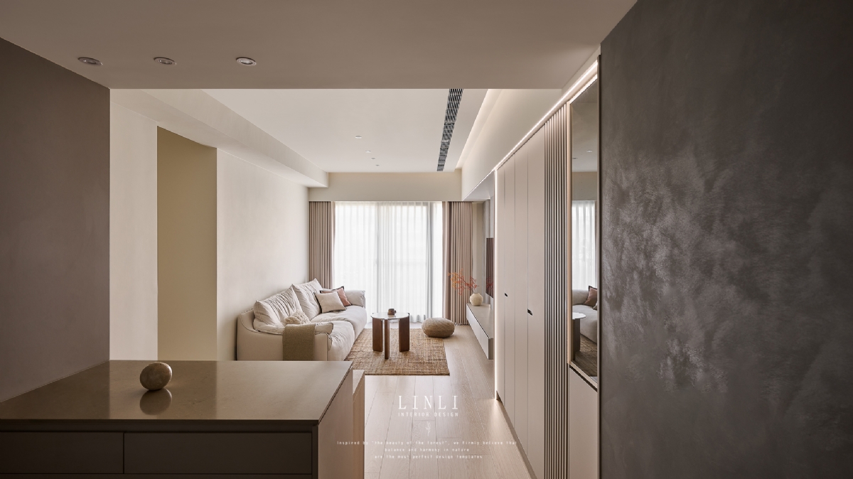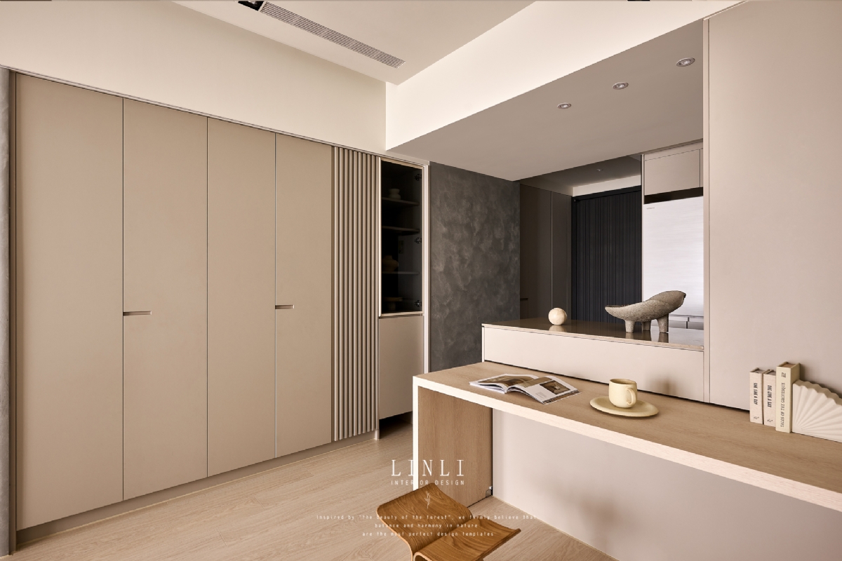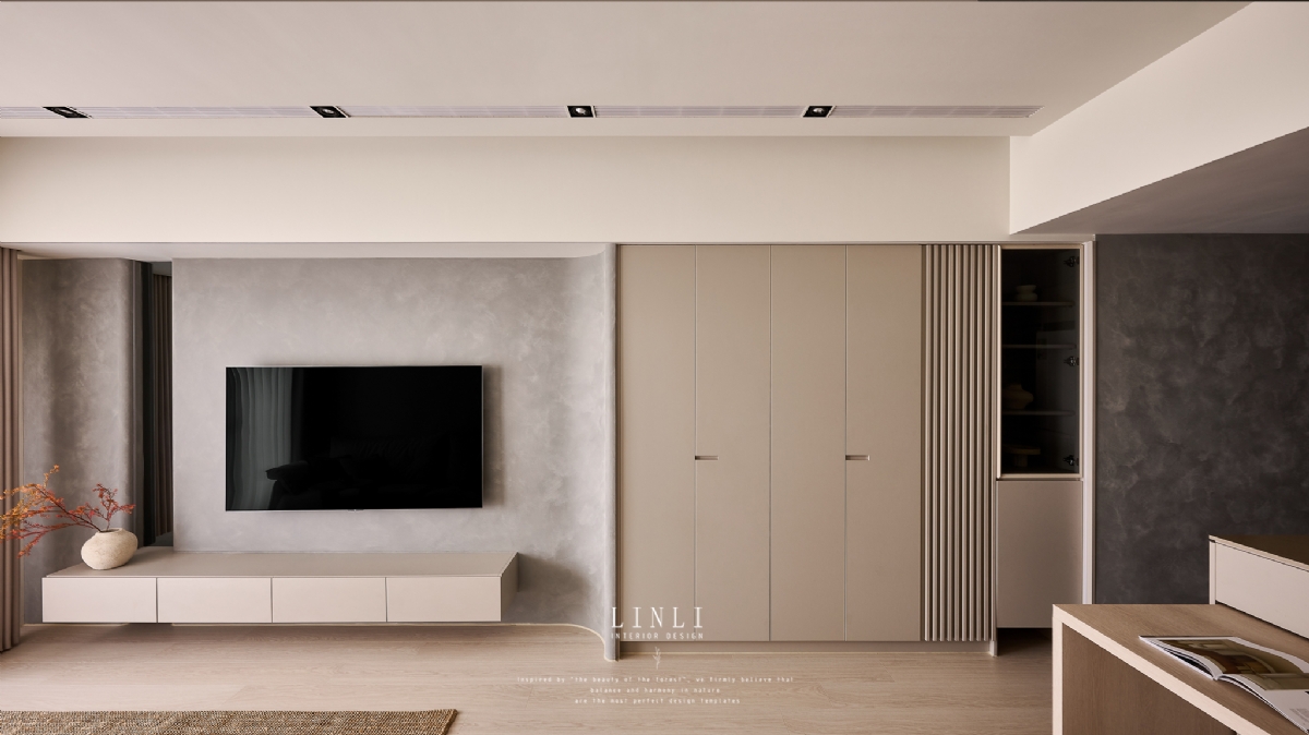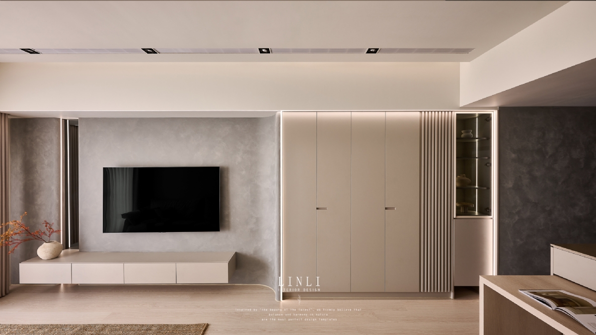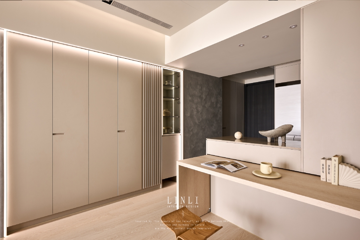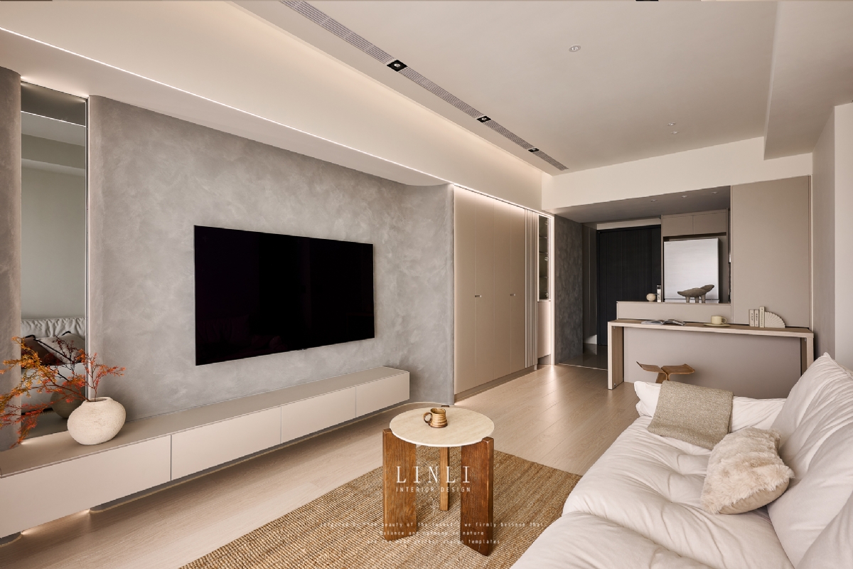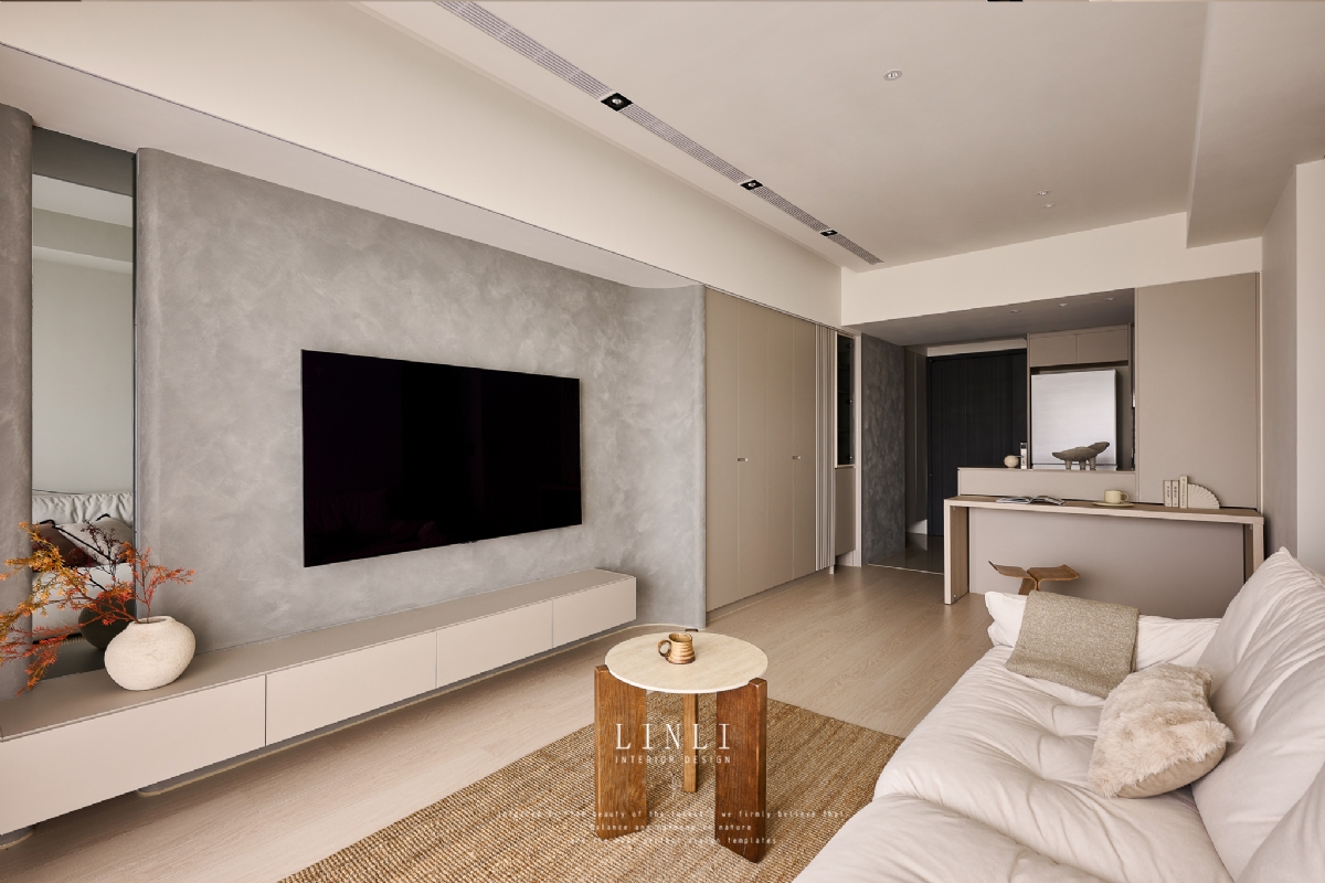 整體以杏色膚感板材、灰色塗料與石材為基調,溫潤而沉穩,搭配格柵與氣氛燈的線條俐落呼應,