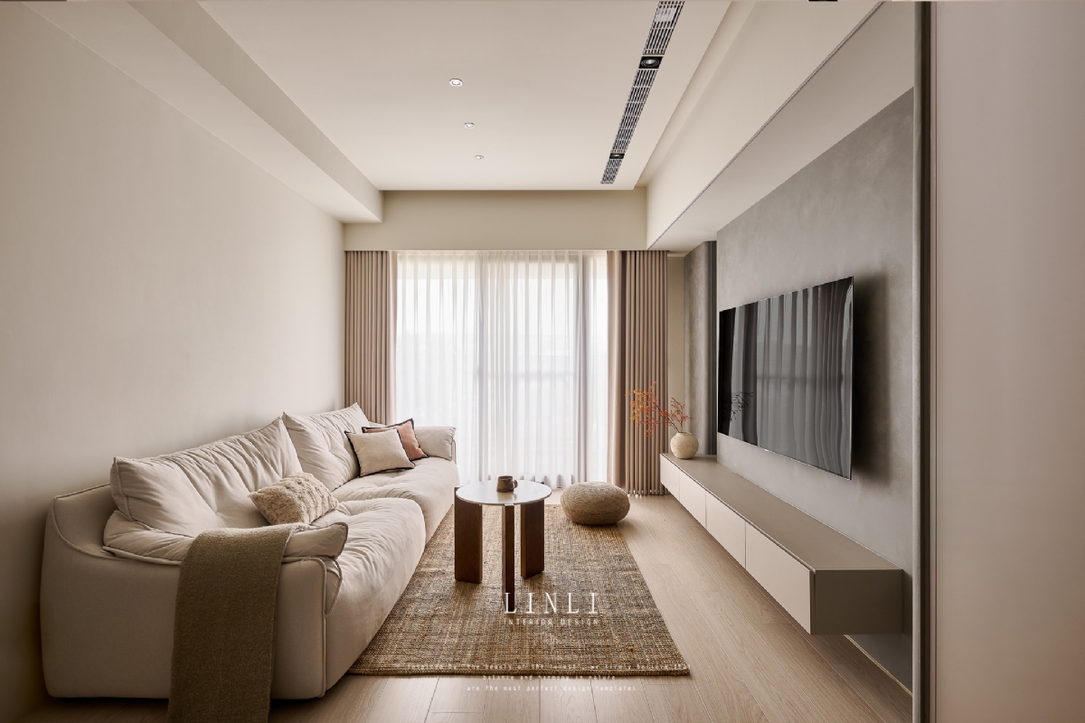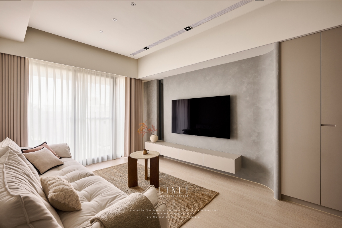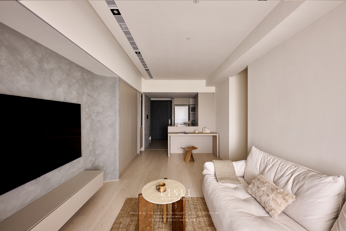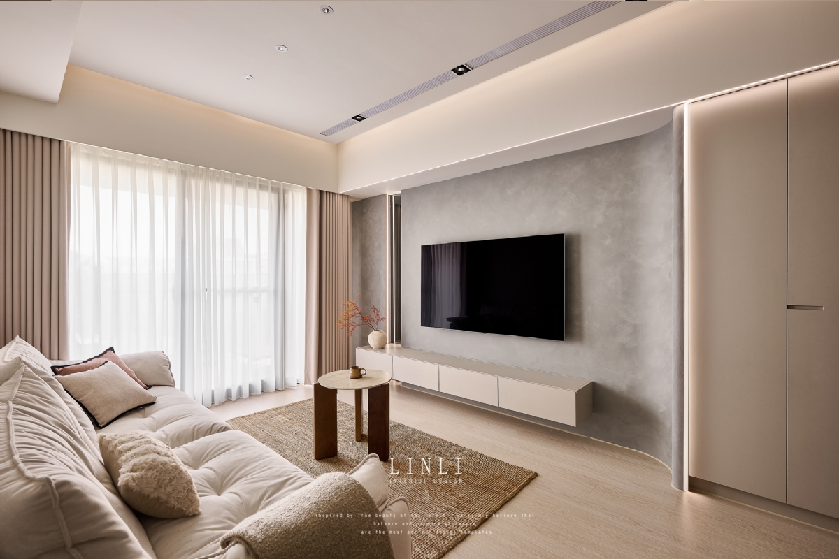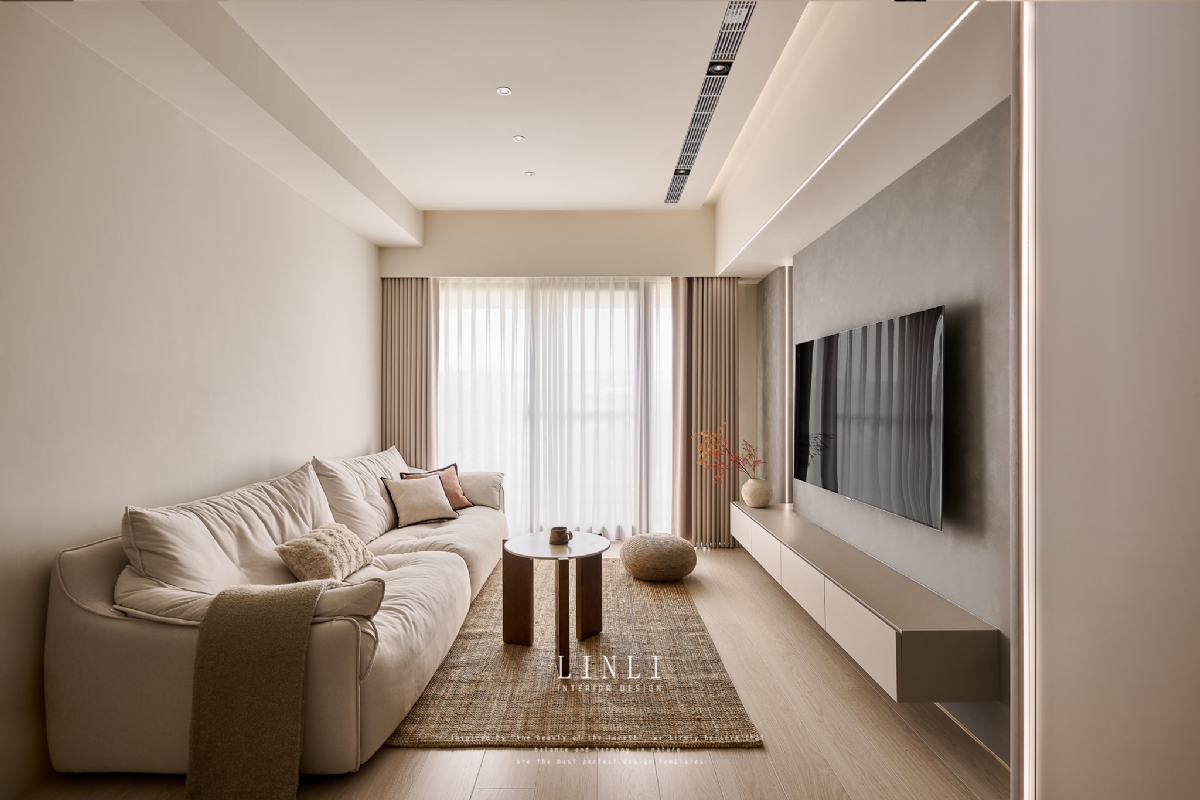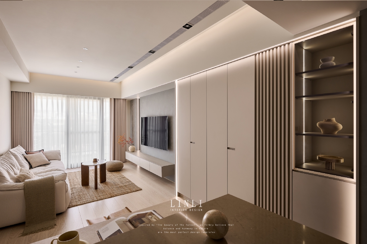 整體以杏色膚感板材、灰色塗料與石材為基調,溫潤而沉穩,搭配格柵與氣氛燈的線條俐落呼應,