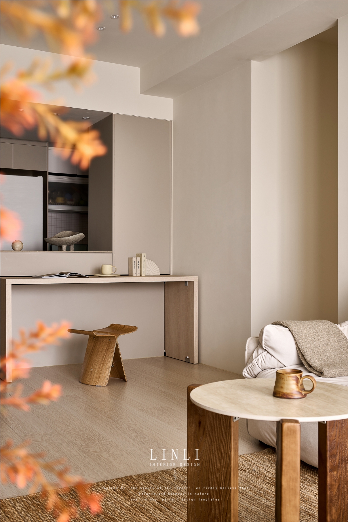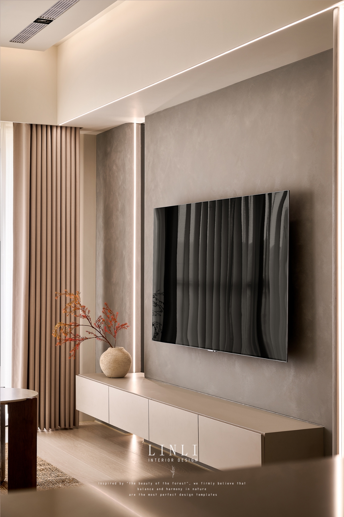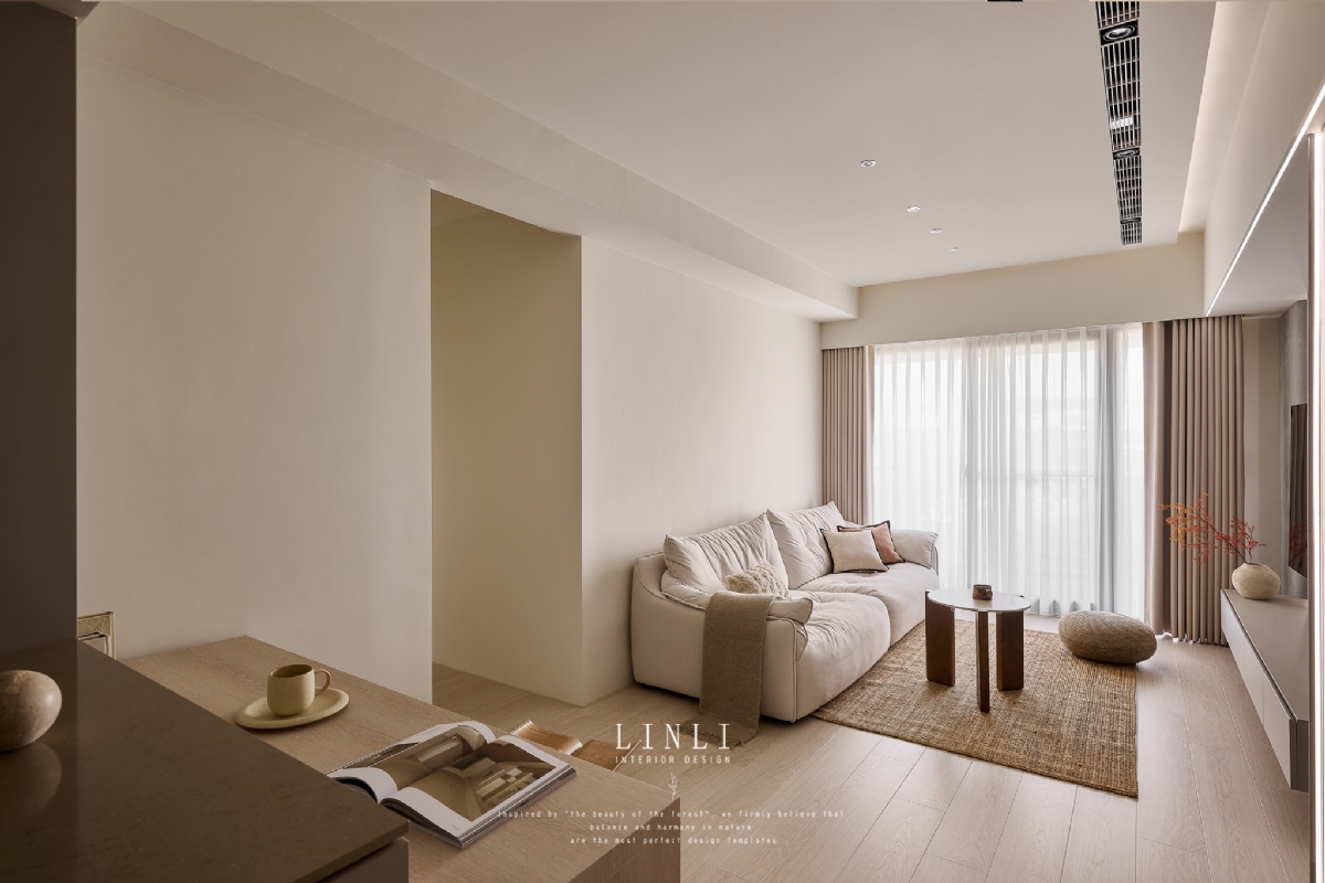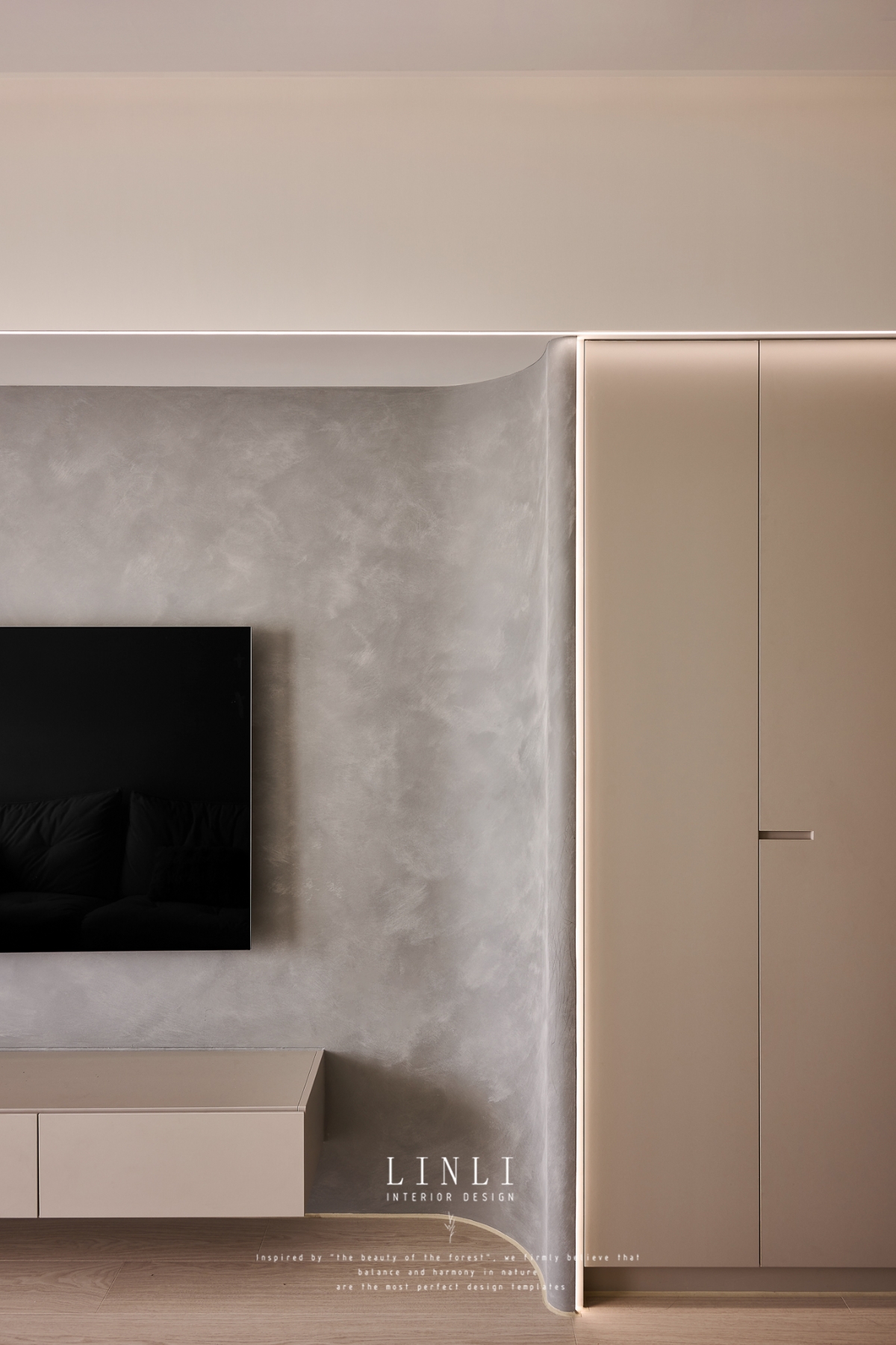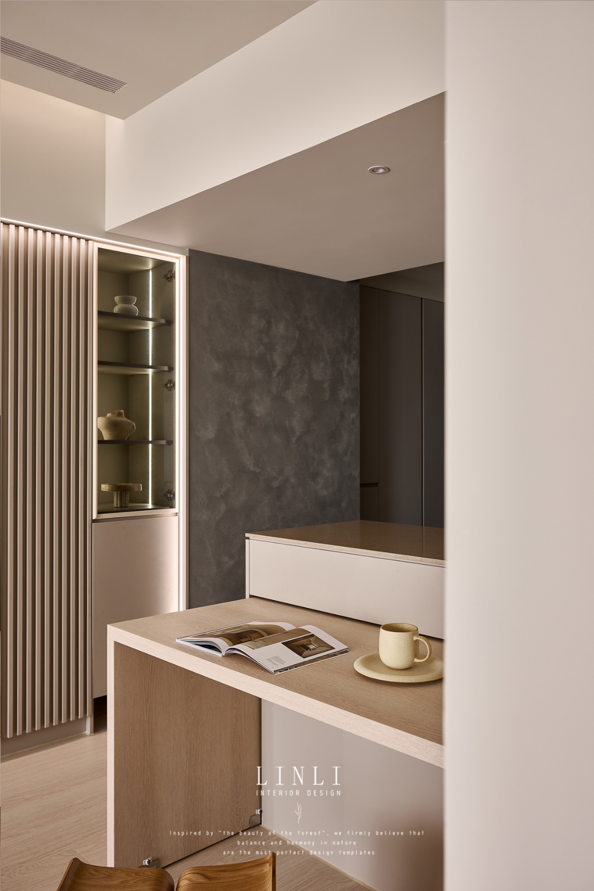 整體以杏色膚感板材、灰色塗料與石材為基調,溫潤而沉穩,搭配格柵與氣氛燈的線條俐落呼應,